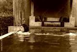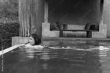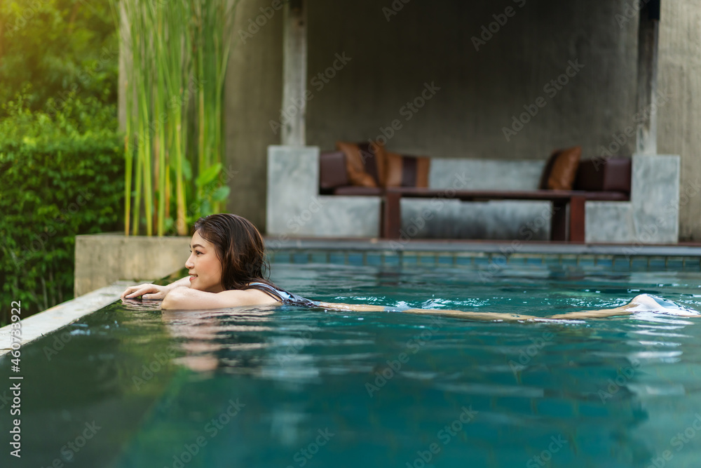 woman hold on to the edge of the swimming pool and splashing water with her feet