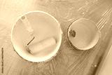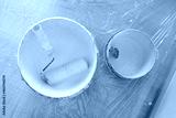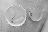 Paint bucket with clear protect plastic in empty room of new house. Top view.