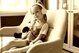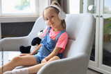 Distance learning. Cheerful little girl girl in headphones studying through online e-learning system.