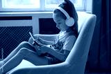 Smiling little girl sitting on sofa playing online games, web surfing information, using funny applications on tablet.