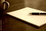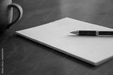 テーブルに置かれた便箋と封筒とボールペンとコーヒー