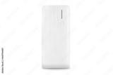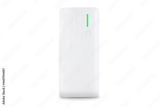 White portable charger with green light label isolated on a white background. Powerbank. Technology. Device. Smartphone. Power button