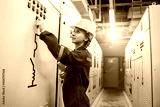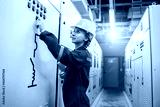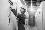 Woman Electrical Engineer working front HVAC control panels, Technician daily check solar cell controls system for security functions in service room at factory.Energy,Ventilation,Air Conditioning.