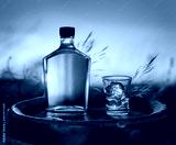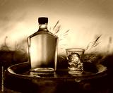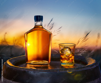 Carafe of whisky and glass of whisky with ice cubes on old wooden cask. Beautiful sunset at the background.