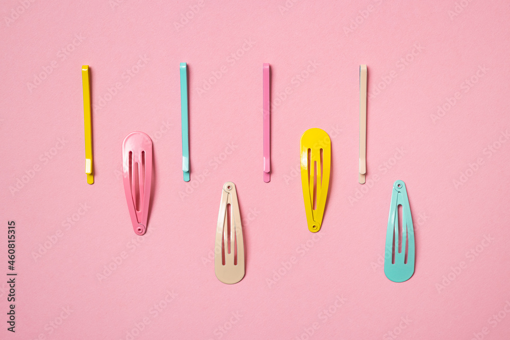 Colorful pastel accessories hairpin on pink background, close up, trendy modern from past