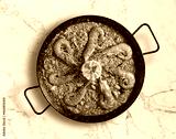 Paella. Traditional spanish food, seafood paella in the fry pan with king prawns and squids
