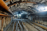 Underground mine. Underground railway for transporting ore. Mine trolley as part of an underground freight train