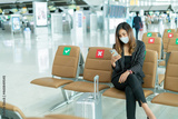 New normal and social distance concept.Asian young woman tourist wearing mask using smartphone searching airline flight status and sitting with distance during corona virus 2019 outbreak at airport