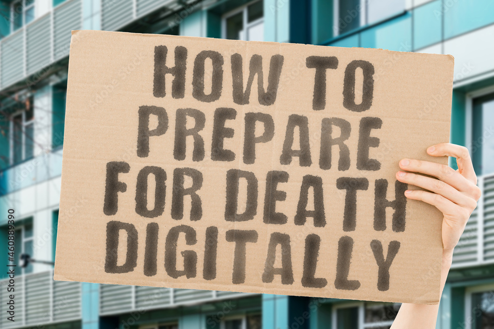 The question " How to prepare for death digitally " on a banner in men's hand with blurred background. End of the life. Finish. Human. Body. Law. Legacy. Last will