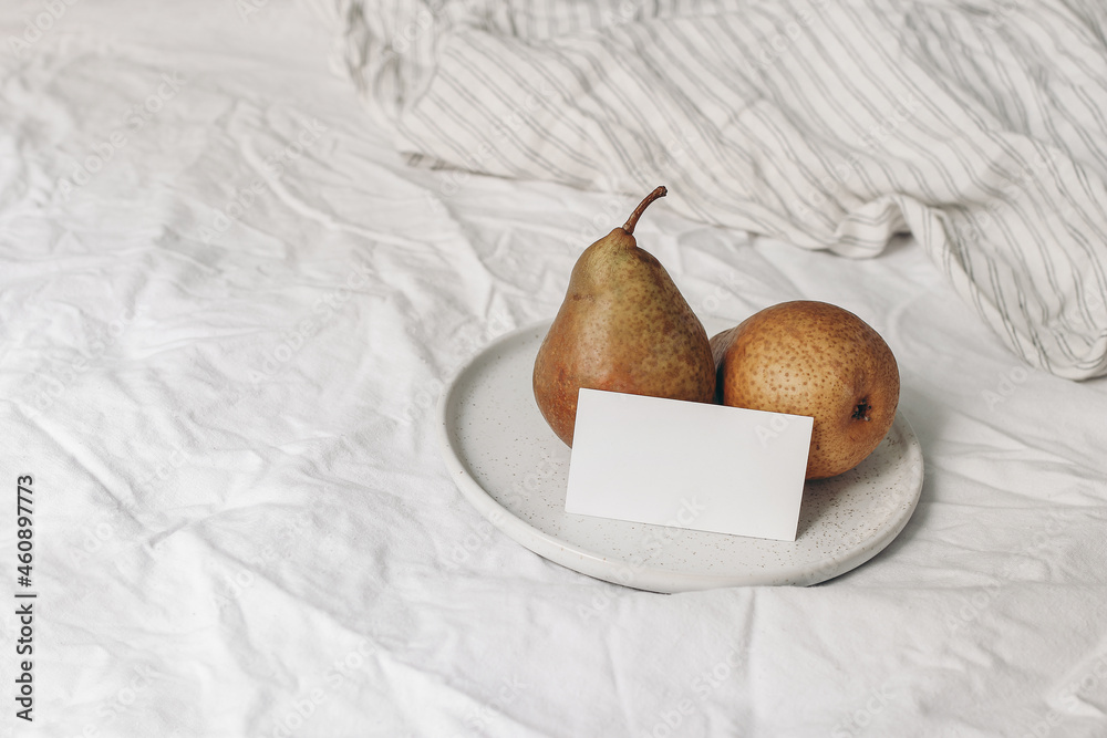 Autumn, summer breakfast in bed composition. Blank business card mockup and pear fruit on ceramic plate. White striped crinckled linen bedding. Feminine lifestyle composition. Interior. Top view.