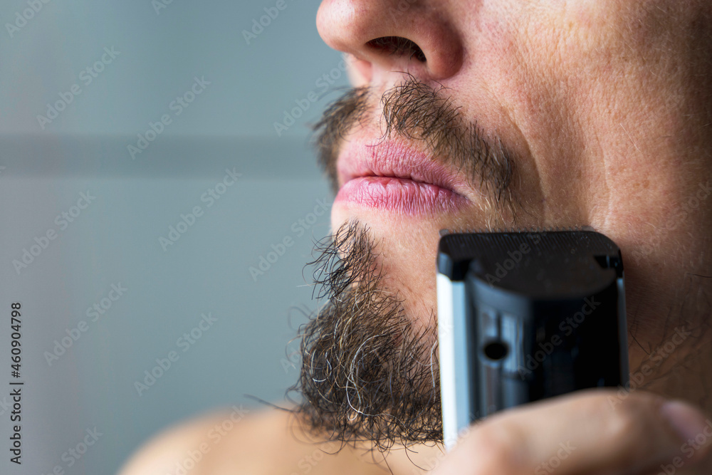 a man cuts his beard and mustache with an electric razor, time to shave, beard and mustache care