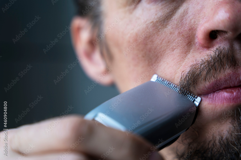 a man cuts his beard and mustache with an electric razor, time to shave, beard and mustache care