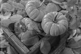 Autumn orange pumpkins, widely used for Halloween, with a background of dry and reddish leaves as well as a wooden box.