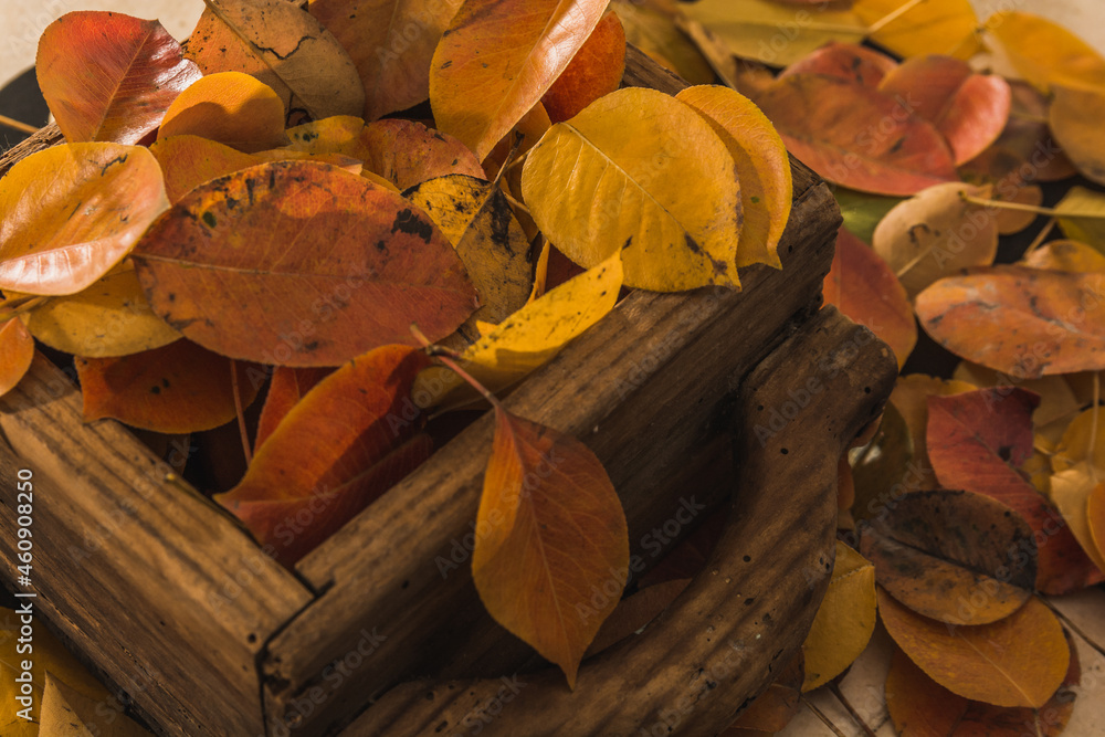 Pear tree leaves in autumn time, with their characteristic reddish, orange and yellow color on a wooden box.