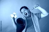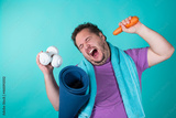 Diet and healthy lifestyle. Funny fat man. Blue background.