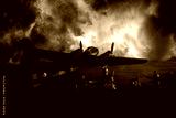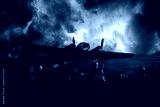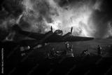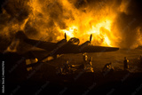 German Junker (Ju-88) night bomber at night. Artwork decoration with scale model of jet-propelled plane in possession. Toned foggy background with light. War scene.