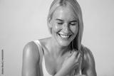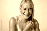Studio shot of a happy caucasian woman adjusting her hair with closed eyes