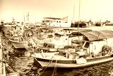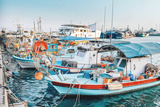 Small colorful fishing boats equipped with nets moored in the Limassol port, Cyprus island