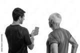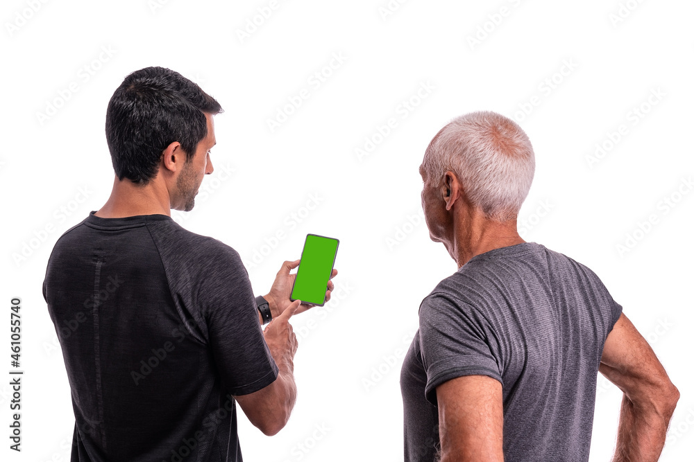 Fitness trainer explains to an elderly man how to use a software application for training On a white isolated background. Copy space
