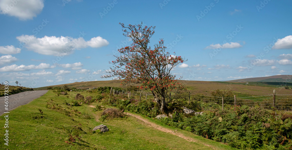 Dartmoor, Devon, England, UK. 2021. A Mountain Ash tree with scarlet berries beside a narrow track on Dartmoor above Widecombe. Dartmoor National Park. UK. Sorbus aucuparia.