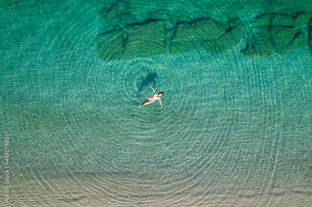 Young woman in a swimsuit lying on sea water on the beach. View from above. Top, drone view
