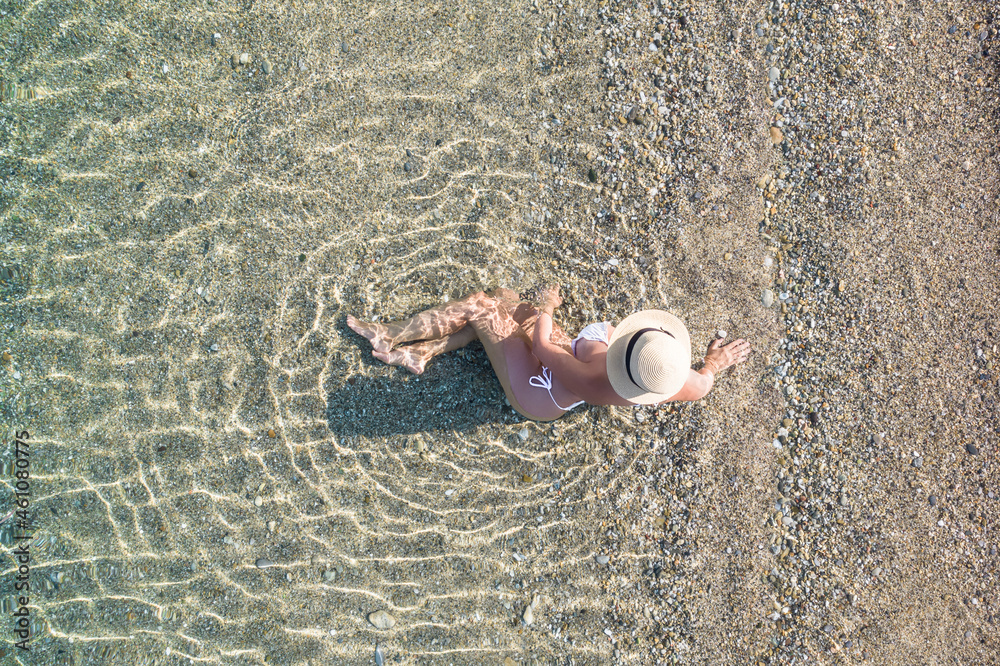 Young woman in hat, swimsuit sitting in the water on the shore of sea on the sand beach. Summer. View from above. Top view, copter