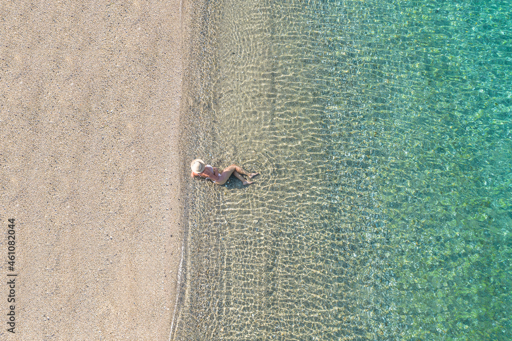 Young woman in hat, swimsuit sitting in the water on the shore of sea on the sand beach. Summer. View from above. Top view, copter