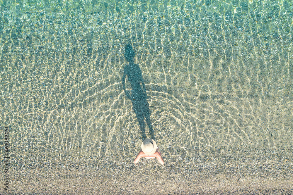 Young athletic woman in swimsuit and hat entering in sea on the sand beach. Summer. View from above. Top view, copter