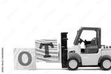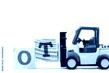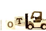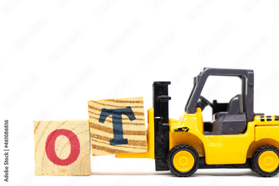 Toy forklift hold letter block T to complete word OT(abbreviation for overtime) on wood background