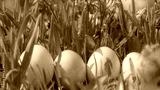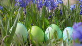 Easter green eggs in the green grass in spring