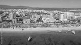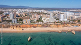 Aerial view of the wide and crowded Portuguese famous Rocha beach in Portimao, Algarve, Portugal. Drone shot