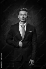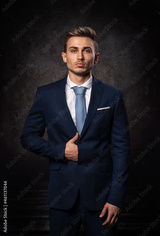 Conceptual portrait of a young, stylish business man, in a blue suit and tie, against a dark textured background.