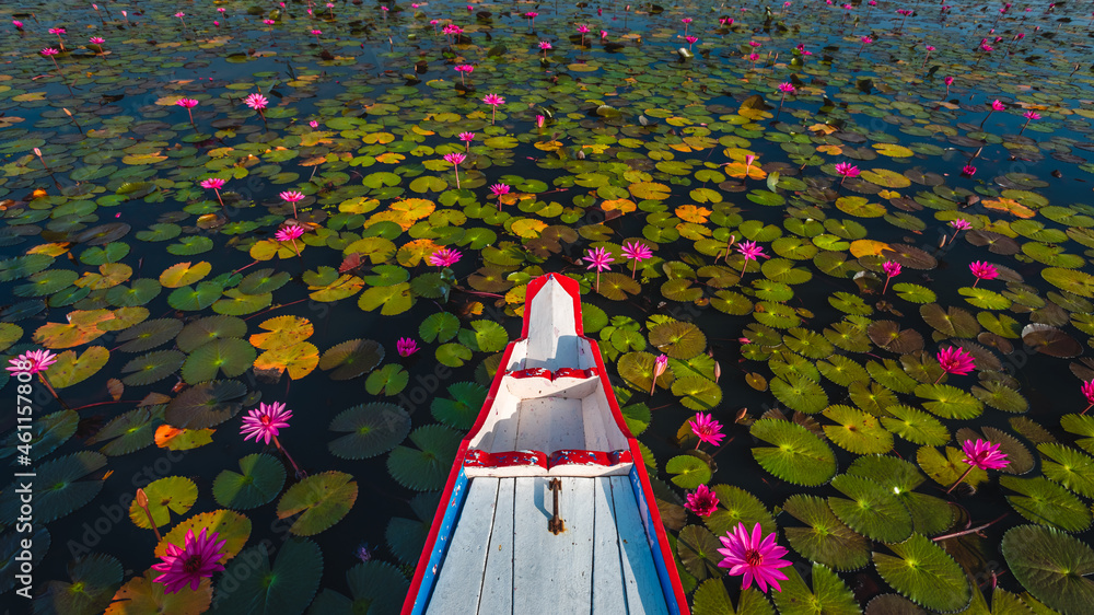 Top view beautiful green nature scenic panorama landscape red lotus flower blooming on lake, Boat for.tourist travel Phatthalung Thailand summer holiday vacation trips, Tourism destination place Asia