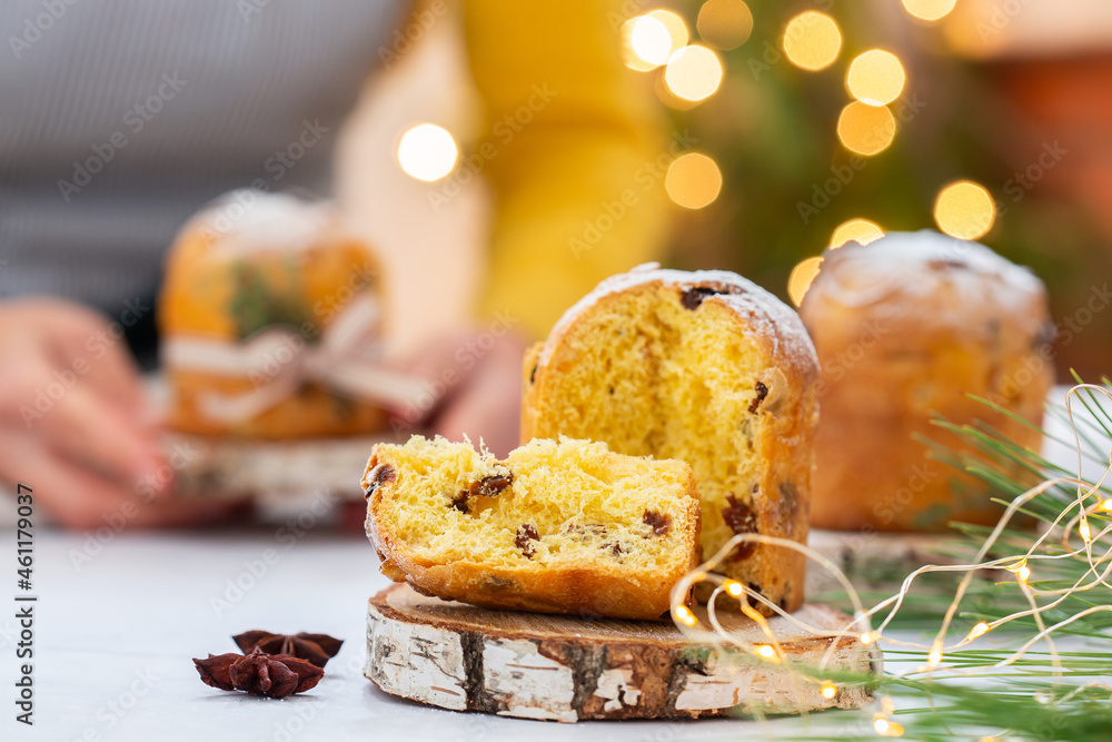 Traditional Italian Christmas cake Panettone with festive decorations