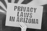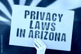 The phrase " Privacy laws in Arizona " on a banner in men's hand with blurred Finnish flag on the background. Private. Client. Market. Info. Information. Identify. Data. Security. Technology