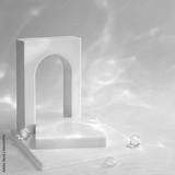 Abstract surreal scene - empty stage with square podium and arch on pink pastel background with glass beads in water. Pedestal for cosmetic, beauty product, packaging mockups presentation