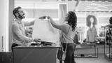 Clothing Store: Young Woman at Counter Buys Clothes. Friendly Retail Sales Assistant Gives her a Shopping Bag with New Clothes. Trendy Fashion Shop with Designer Brands.