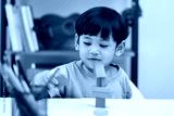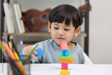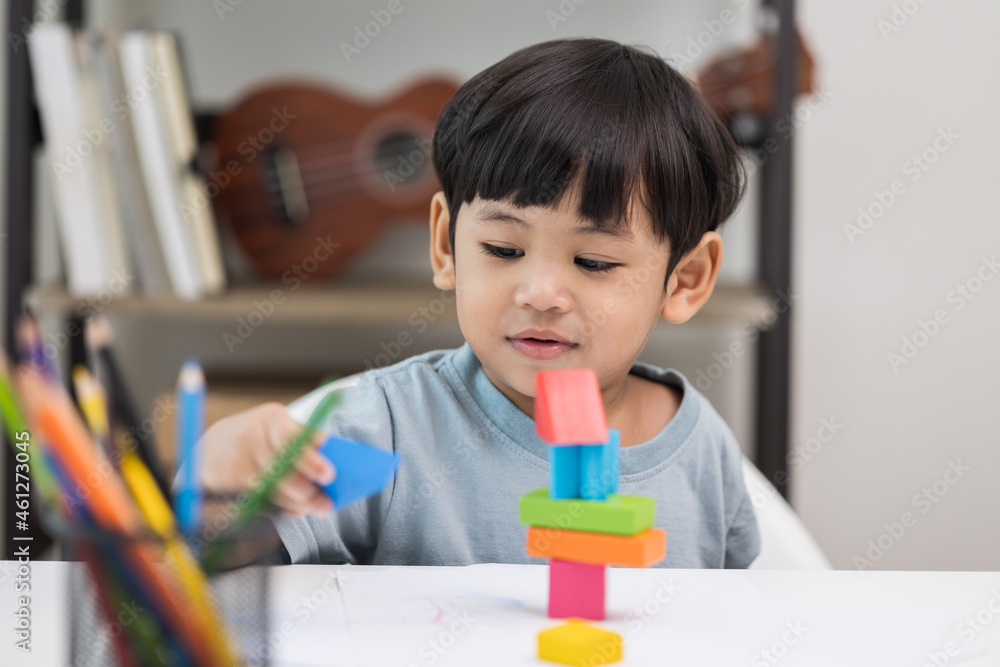 Asian little boy education from home. Developing children's learning before entering kindergarten Practice the skills of playing with wooden toys in living room.