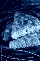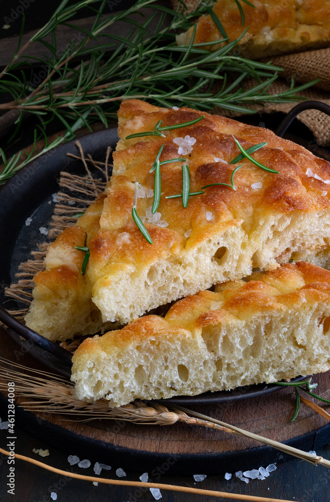 Typical Mediterranean focaccia with olive oil and rosemary on a dark background