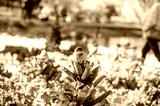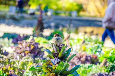 A sparrow sits on top of a plant in the garden in summer.