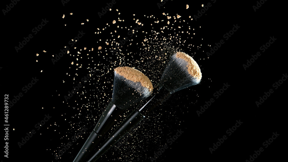 Soft cosmetics brushes releasing a cloud of beige face powder.