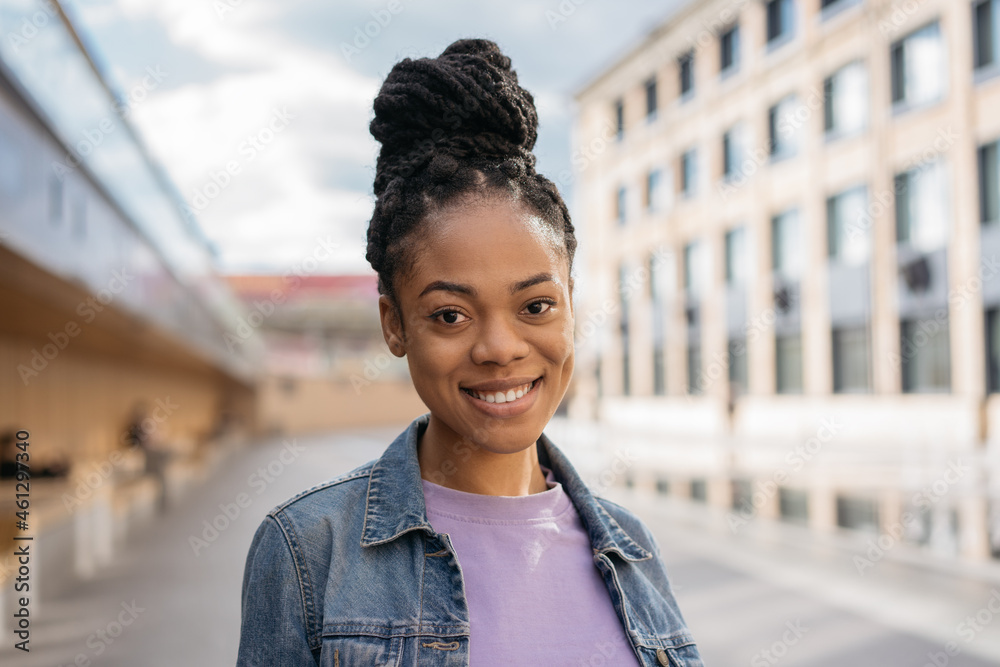 Close up portrait of smiling African American student standing in university campus. Education concept. Young beautiful female with stylish hairstyle looking at camera walking on the street