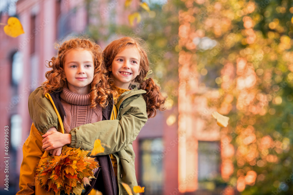 Two red-haired girls, sisters, cheerfully walk along the city street during the golden autumn leaf fall.