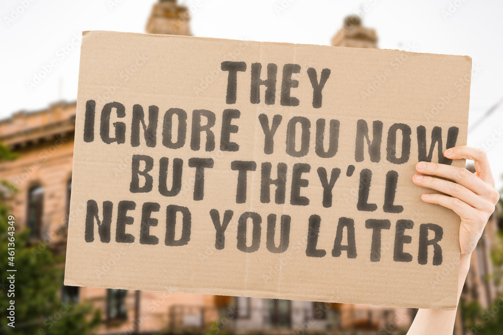 The phrase " They ignore you now, but they’ll need you later " on a banner in men's hand with blurred background. Possibility. Business metaphor. Optimist. Positive thinking. Thoughts. Ignorance