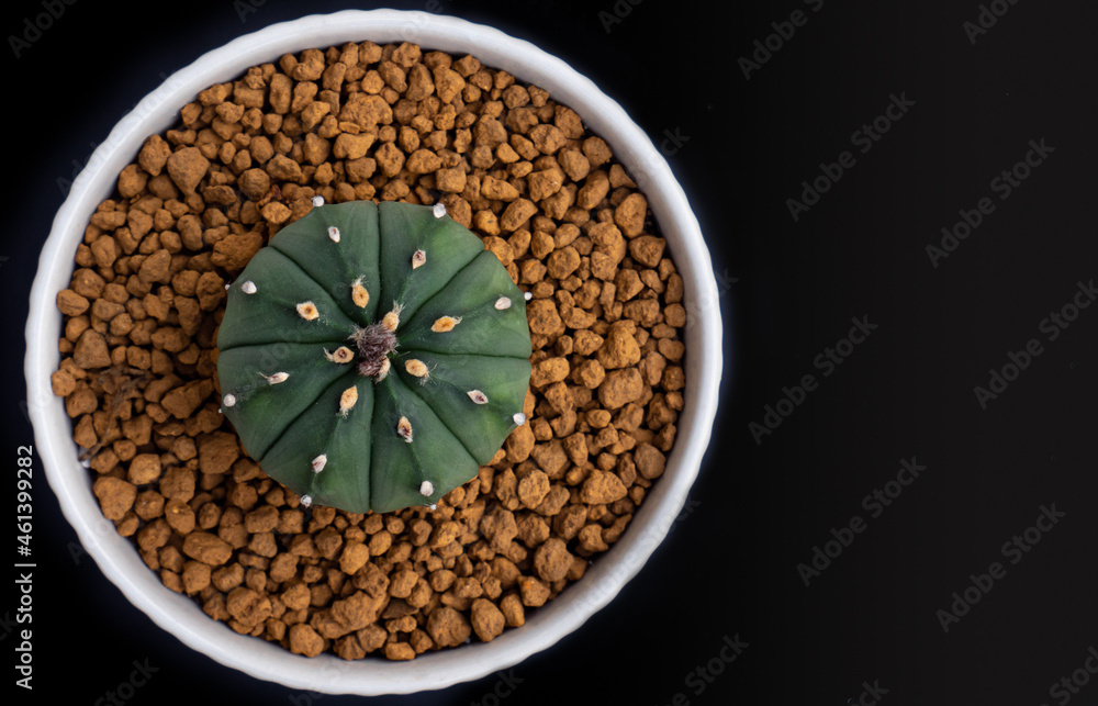 Top view cactus. complete green color In a white plastic pot with clay beads sprinkled on a black background.