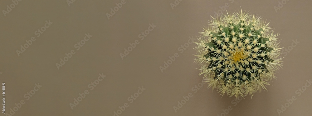 Banner with Top view of a green cactus with large sharp spines on a colored pastel background. Houseplant Golden Barrel Cactus, Echinocactus Grusonii Plant. Close-up, copy space.