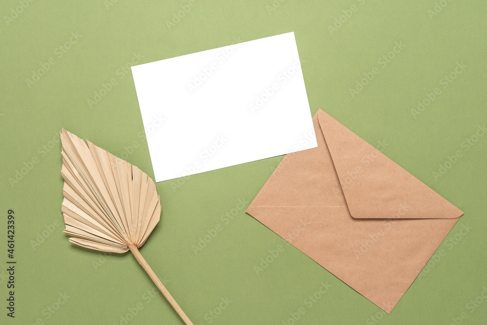 Blank card mockup, craft envelope and dry palm leaf on olive color paper background. Top view, flat lay. Stationery modern still life.