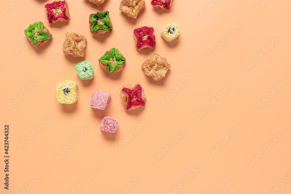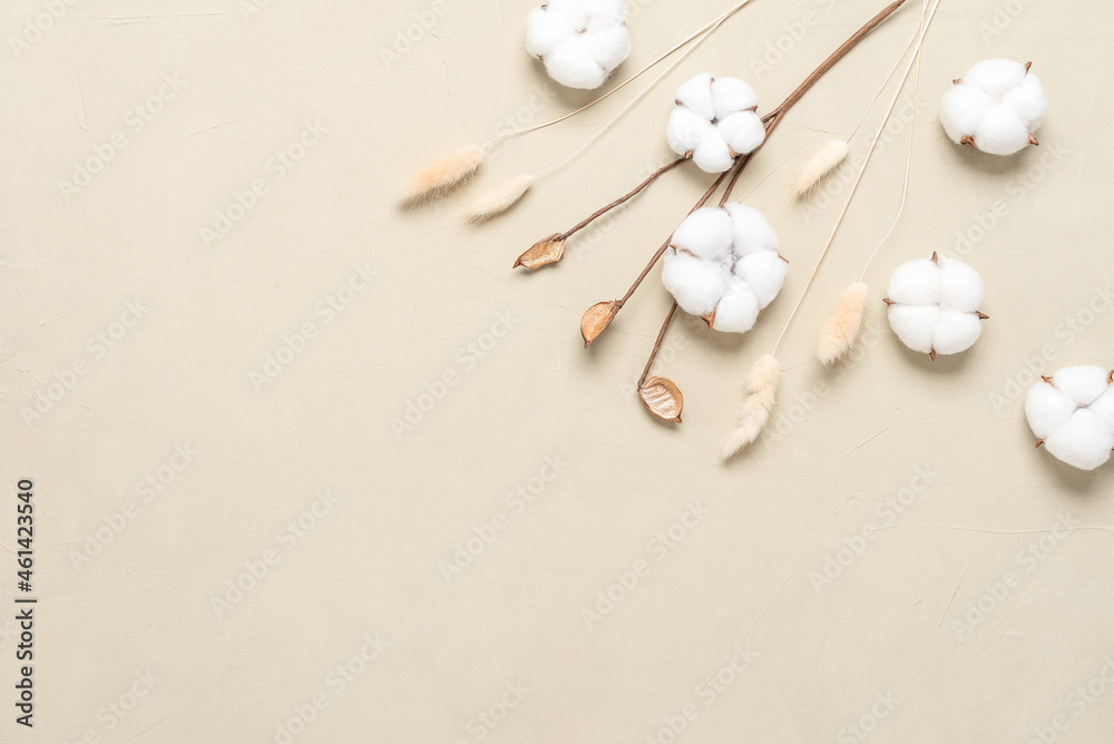 Cotton flowers and dry grass lagurus on a beige plaster background. Autumn floral composition. Top view, flat lay.
