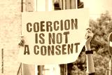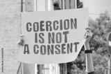 The phrase " Coercion is not a consent " on a banner in women's hand with blurred background. Rights. Violence. Aggression. Justice. Abuse. Aggressive