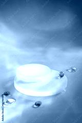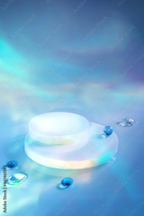 Abstract surreal scene - empty stage with cylinder podium and circle shape on holographic neon blue colored background. Pedestal for cosmetic, beauty product, packaging mockups display presentation